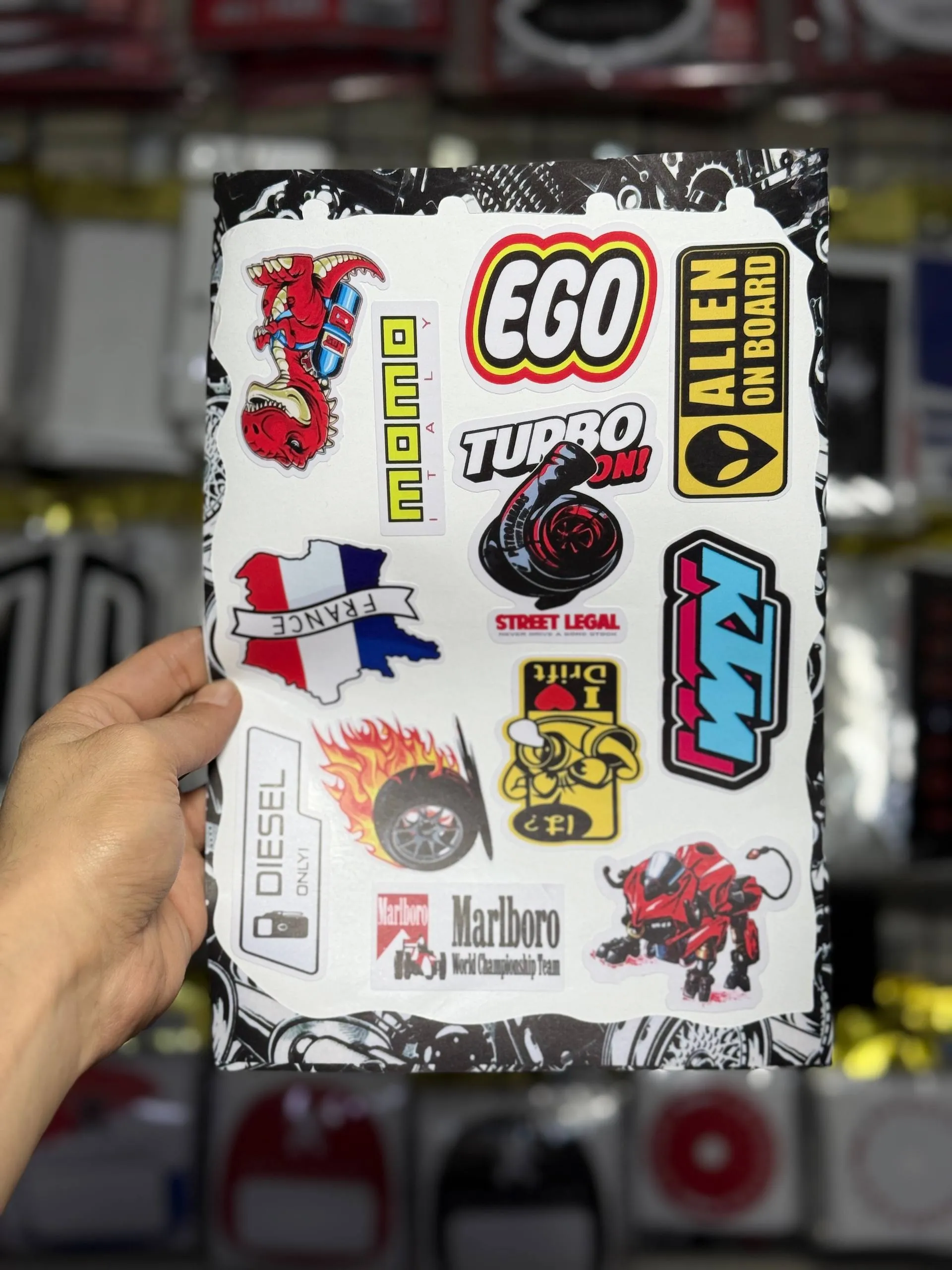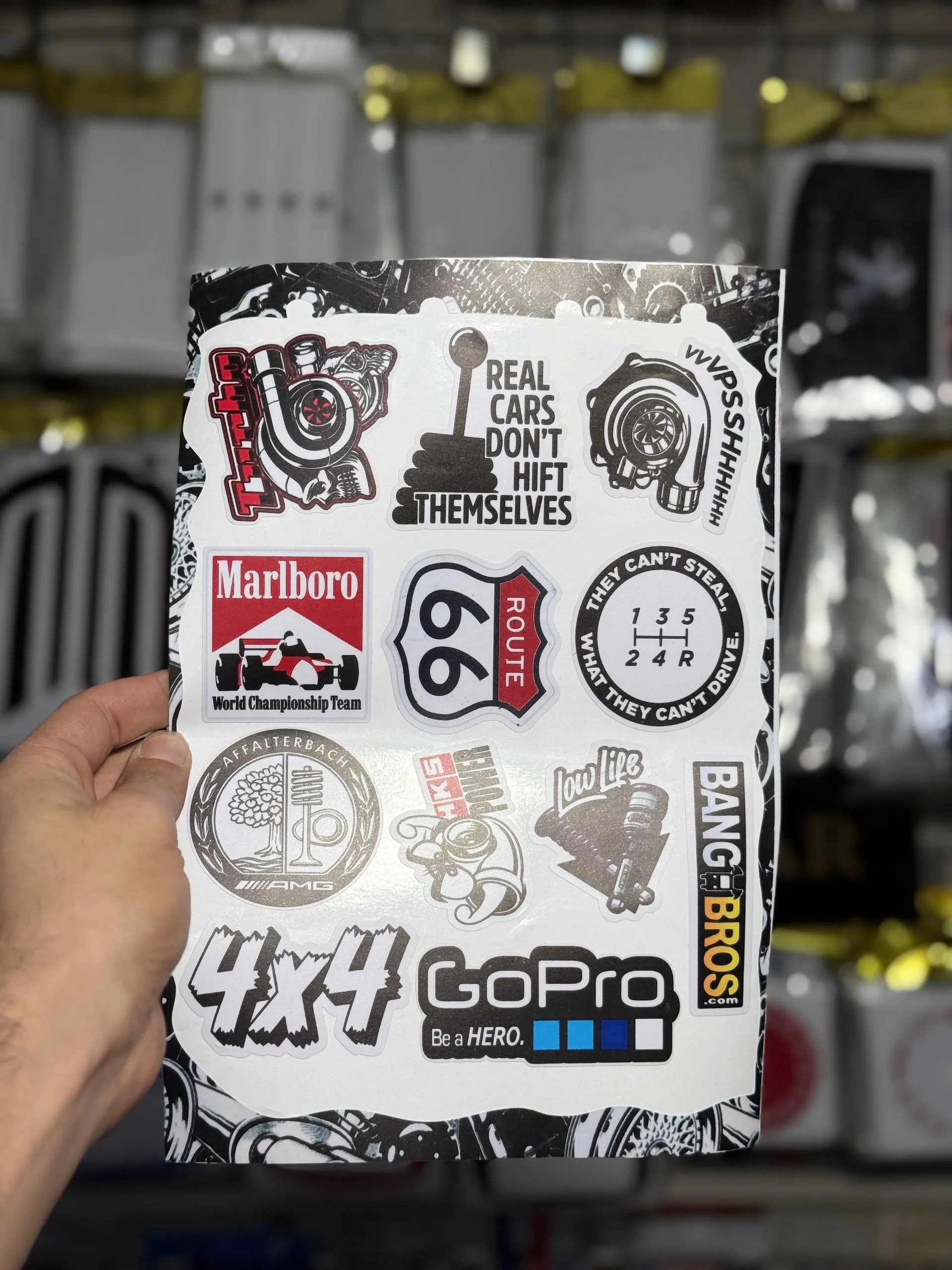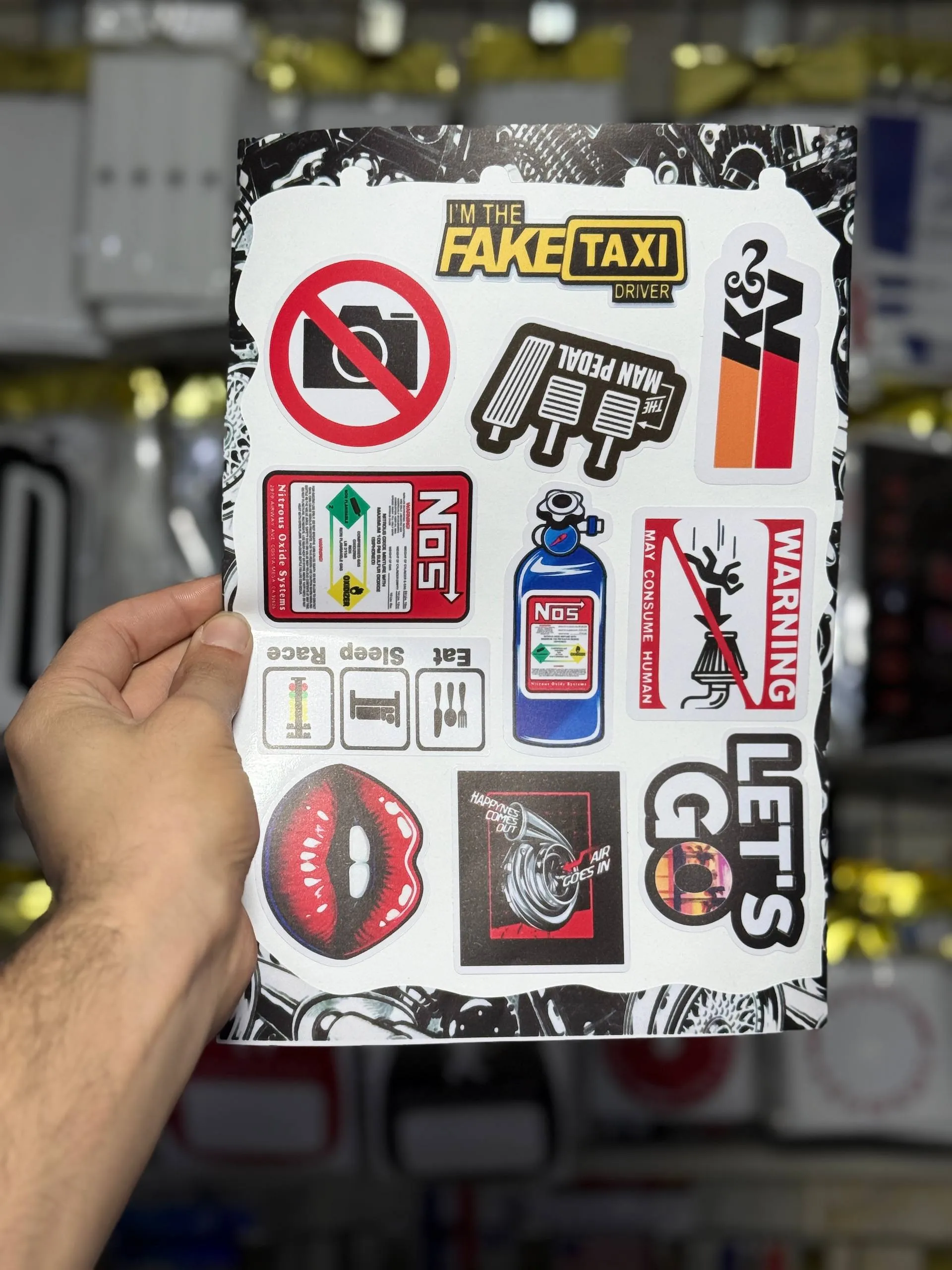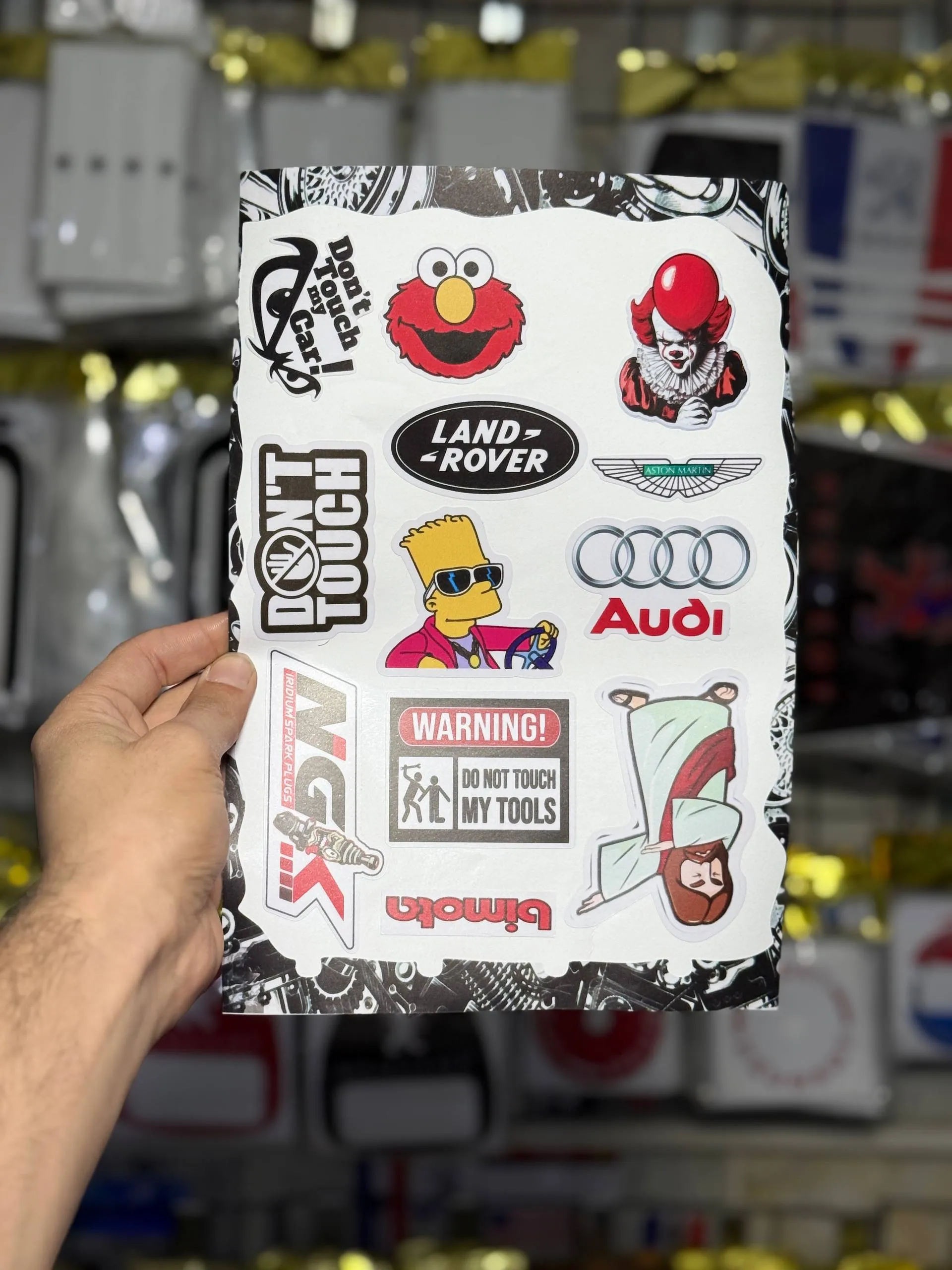 پک ۲۴ عددی استیکر سلفون‌دار، یک مجموعه متنوع و جذاب از انواع استیکرهای محبوب دنیای خودرو و فانتزیه.